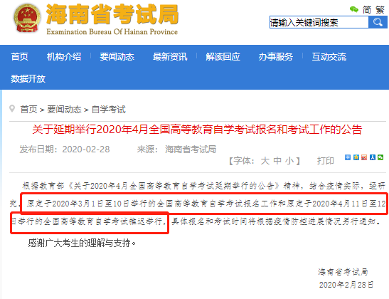 官宣:海南省2020年4月自学考试报名和考试工作延期通知