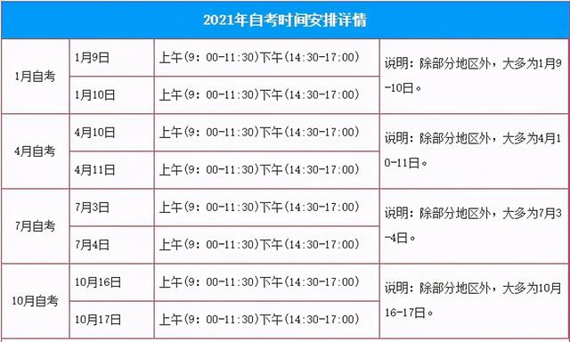 成人自学考试本科报名在全国各省份是不一样的,有的省份是在4月和10月,有的则是1月、4月、7月、10月都可以考试,具体的考试时间分别在各考试月的最后两个周六、周日。2021年自学考试时间安排详情可以参考下表: