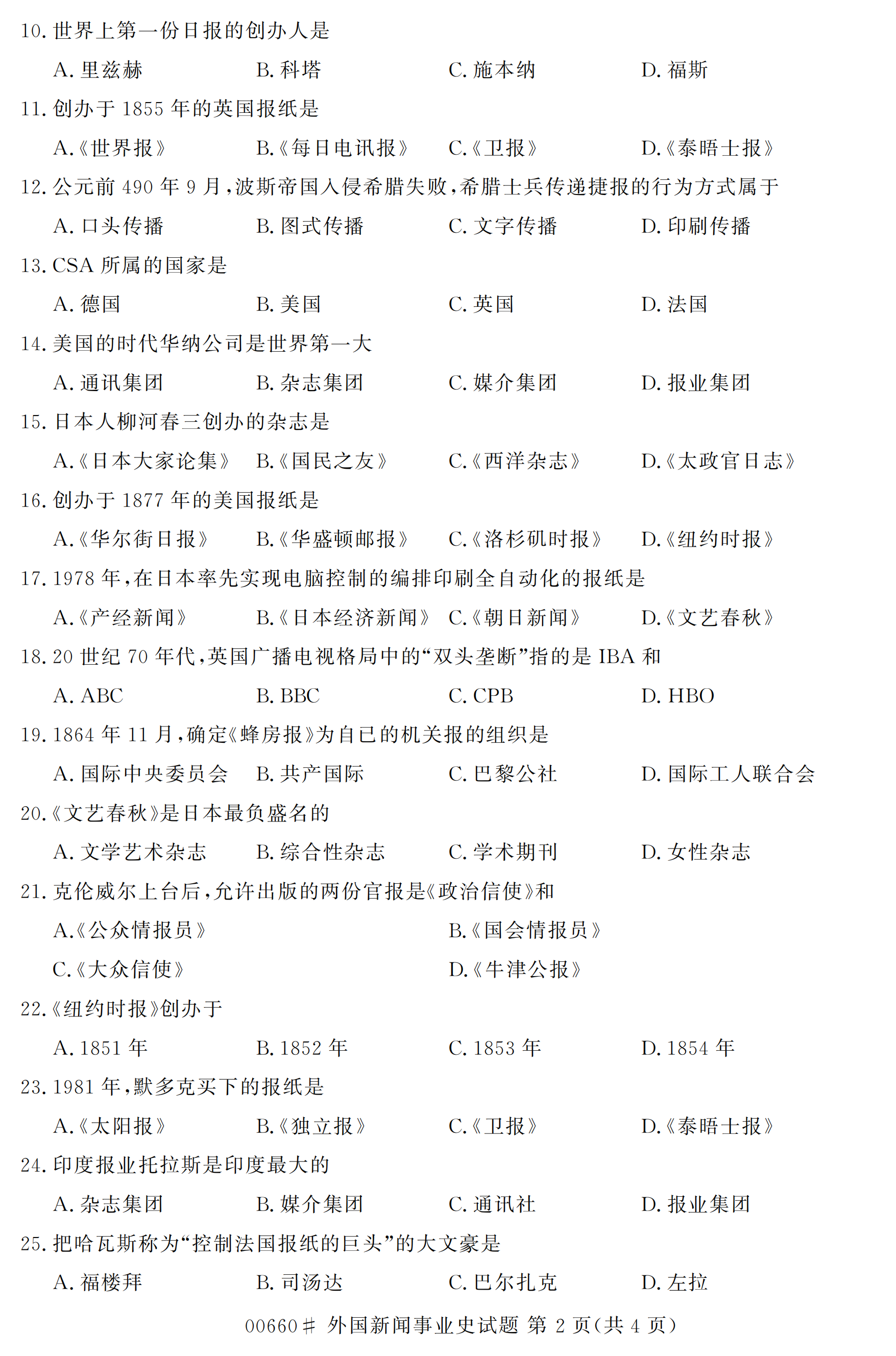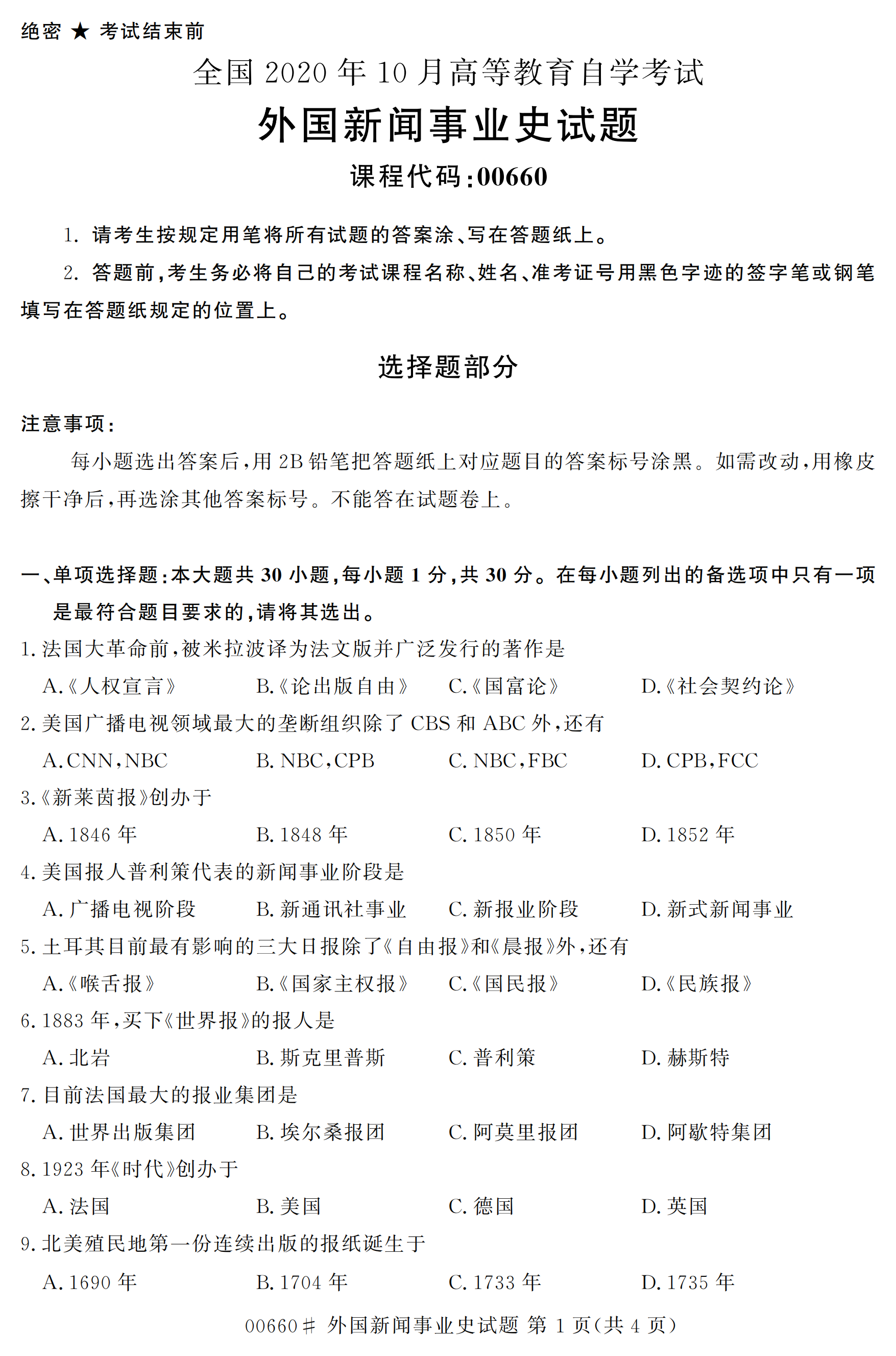2020年10月海南高等教育自学考试外国新闻事业史00660真题